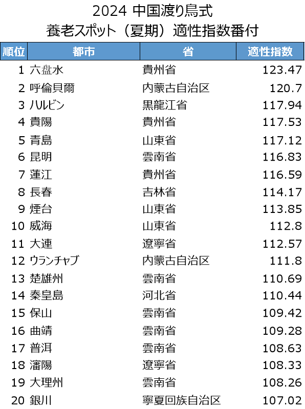 高齢者にとって最適な避暑地はどこか?そんなテーマで、上海交通大学安泰経済管理学院が7月11日、『中国渡り鳥式隠居者の夏期生息地適性指数ランキング(2024中国候鸟式养老夏季栖息地适宜度指数)』を発表した。76都市を気温、湿度、空気質など17項目で評価し、ランキング化したもので、六盤水(貴州省)、フルンボイル(内蒙古自治区)、ハルビン(黒竜江省)がトップ3となった。これに貴陽、青島、昆明、遵義、長春、煙台、威海、大連が続いている。