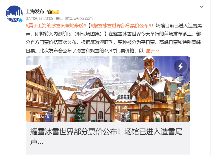 上海で世界最大級の屋内スキー場「耀雪冰雪世界」が誕生する。総建築面積は約35万㎡、屋内スキー場の面積は約9万㎡に及び、東京ドーム(46,755m² )約2個分に相当する。北欧の街並みをコンセプトとしたストリートが再現されており、大型レジャープールや3軒のリゾートホテルも併設されている。平日4時間の入場料は420元(約9,000円)。8月8日から販売が開始され、同月中にテスト運営がスタートする予定だ。(編集:耕雲)