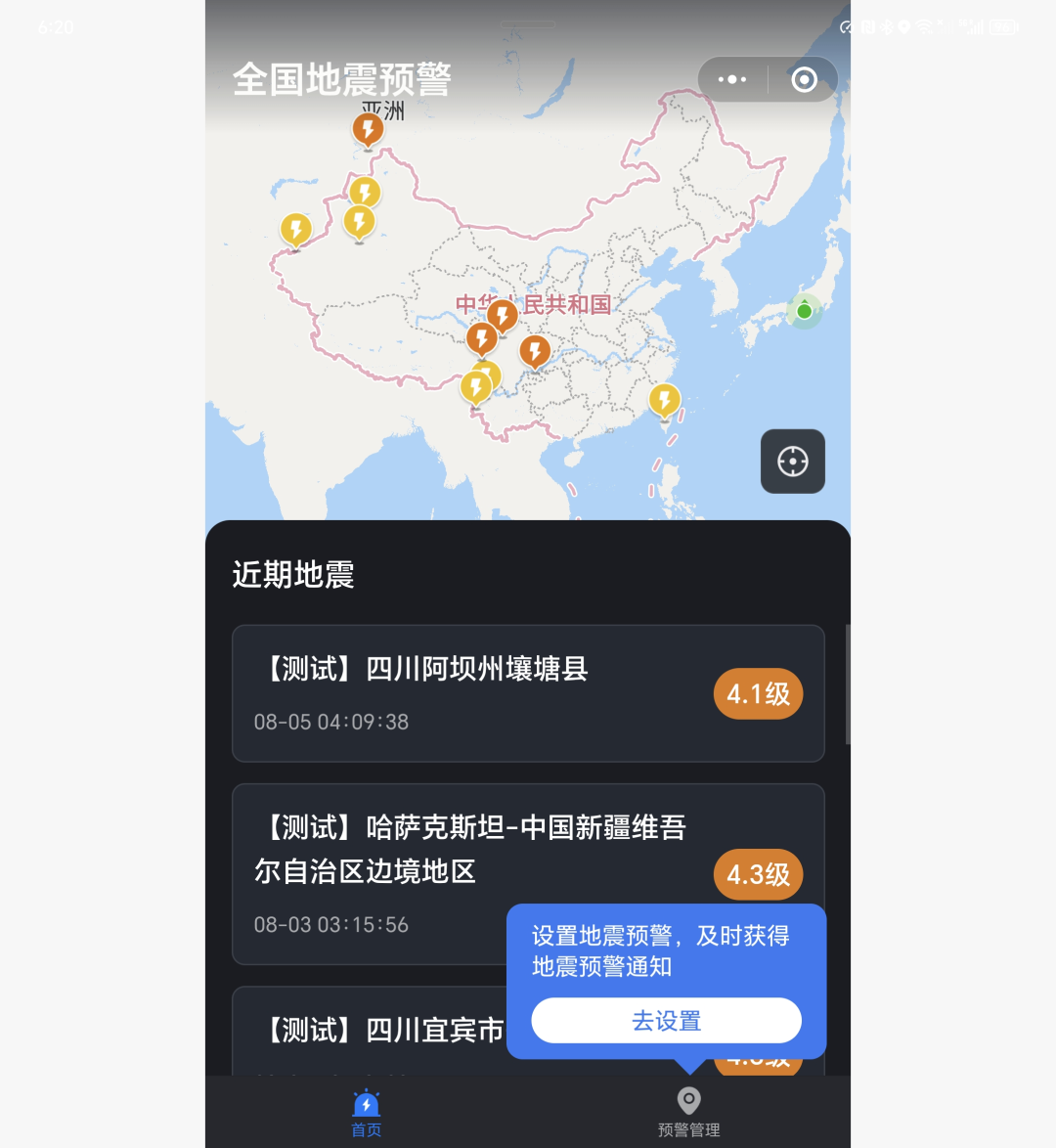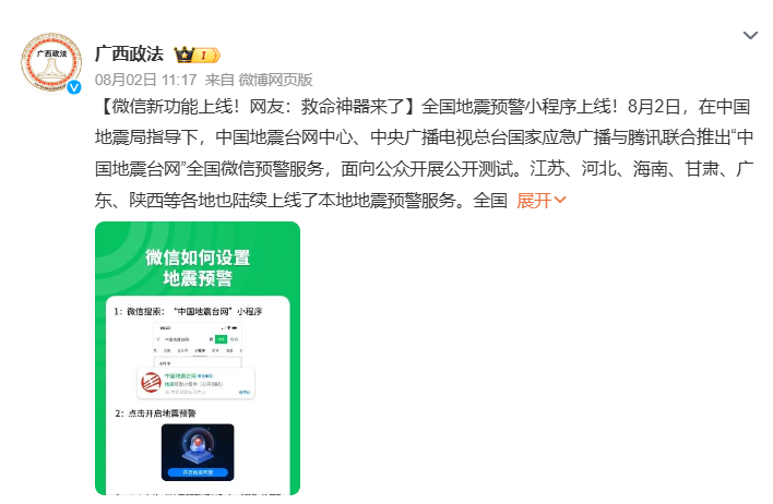 地震警報サービスの公開テストは江蘇省、河北省、海南省、甘粛省、広東省、陝西省など地域ごとに順次開始されており、Weixinのユーザーはミニプログラムを通じて地震警報を取得することができる。