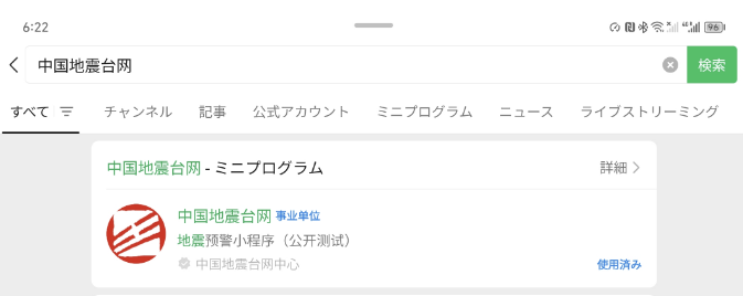◉ステップ1:「中国地震台網」ミニプログラムをWeixinで検索する。