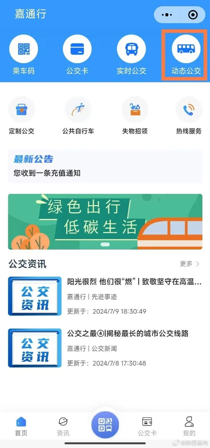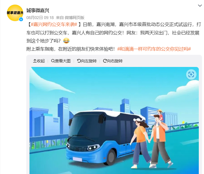 7月31日には浙江省嘉興市でも「動態公交」の名称で同類のサービスが始まった。運行時間は8時から16時までで、東は永紅村、南は祥和花園A区、西は梅花洲景区(石仏寺)、北は鳳北路までの約3平方キロメートルが対象エリアになる。エリア内には梅花洲景区(石仏寺)、桃園小洲、文化体育公園、鳳南小区、鳳橋農貿市場など36のバス停があり、位置情報をオンにすると最寄りの乗車地点が自動的にマッチングされる。乗車地と降車地は所定の運行エリア内である必要がある。
