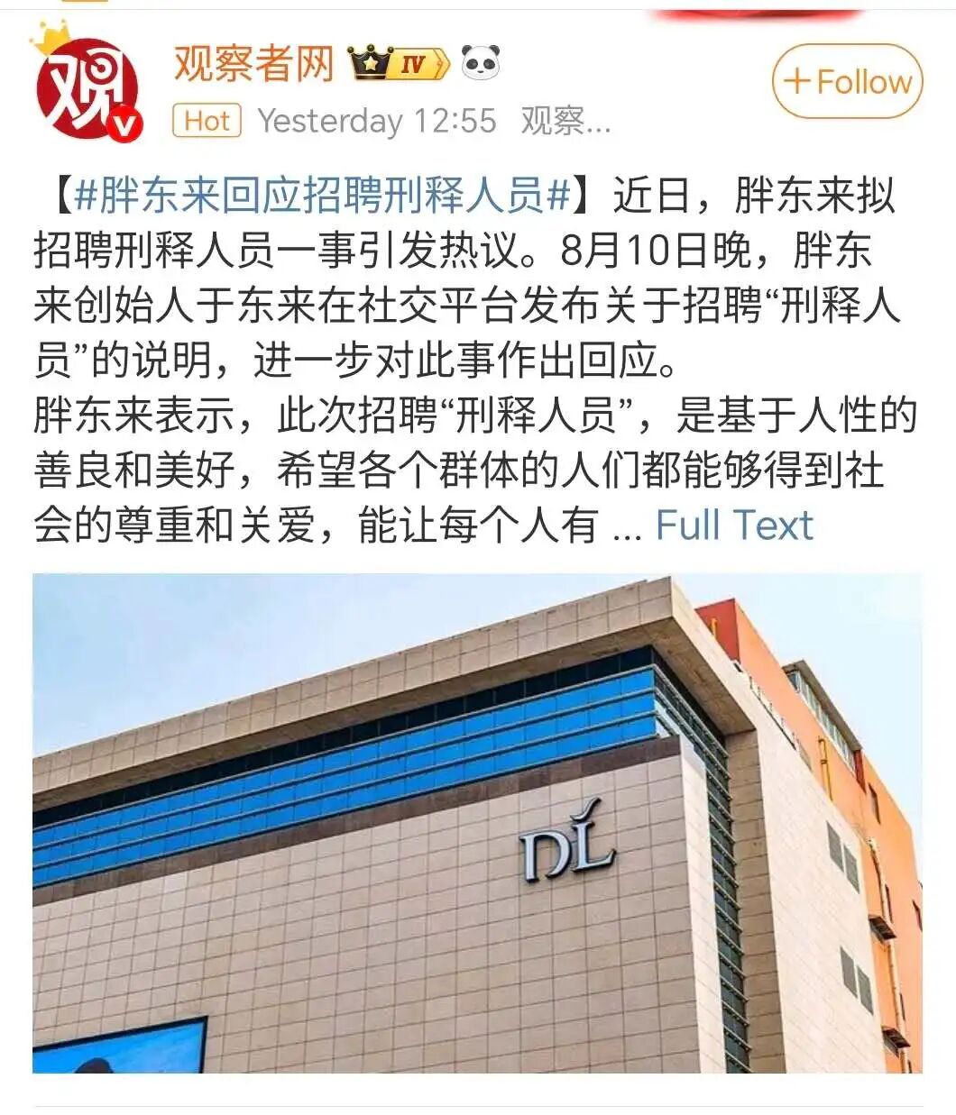 胖東来(パン・ドンライ)は中国・河南省許昌市を本拠とし、許昌・新郷などで店舗を展開する小売企業である。創業者の于東来氏は8月10日、SNS(微博)で刑罰を終えて釈放された人を採用する方針を公表した。初回は約20人の受け入れから始め、将来的には中・重度の経歴を持つ人にも段階的に枠を広げる計画だ。