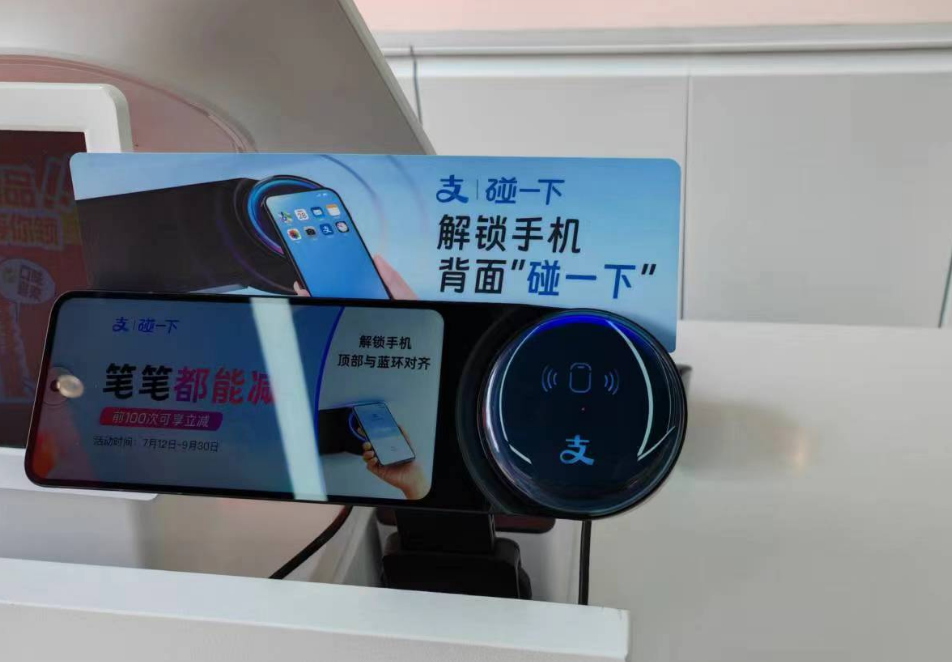 NFC技術を利用した"タッチ決済”でいま最も熱い視線が注がれているのがアリペイ(Alipay)の「碰一下(Peng Yi Xia)」だ。小規模店舗のレジでも、決済用のQRコードを印刷したプレートとともに「碰一下」専用の決済デバイスが設置されているのを目にすることが多くなってきた。決済デバイスには、持ち運び可能なハンドヘルド型と据え置き型の二種類があり、どちらも4Gネットワーク接続機能が内蔵されているという。