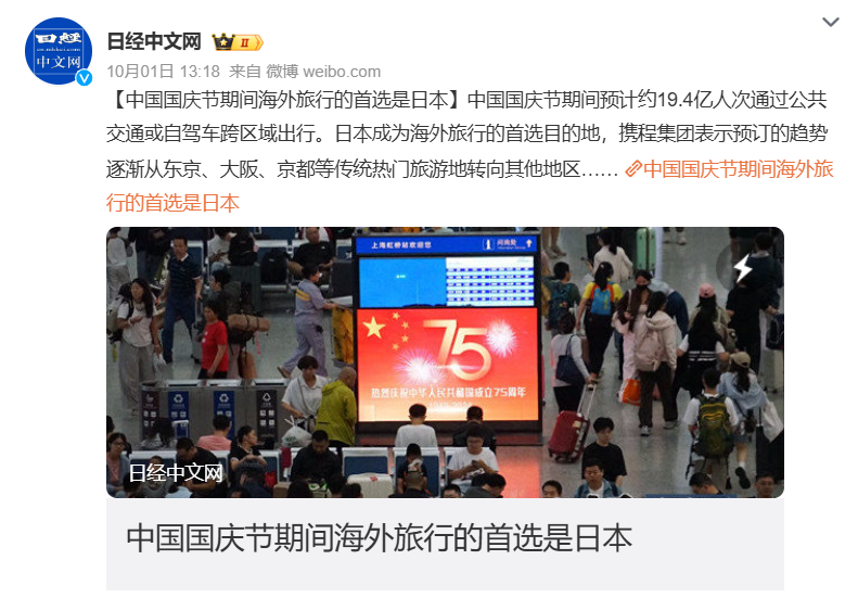 今年の国慶節連休では、10月1日から7日までの7日間で中国の国内外を延べ19億4000万人が移動したとされる。海外旅行ニーズも増加し、シートリップ(携程)グループが発表したデータによれば、2024年の国慶節期間中(10月1日から7日)における海外旅行商品の1日平均販売量は過去最高を記録し、2019年のパンデミック前の水準を上回ったという。