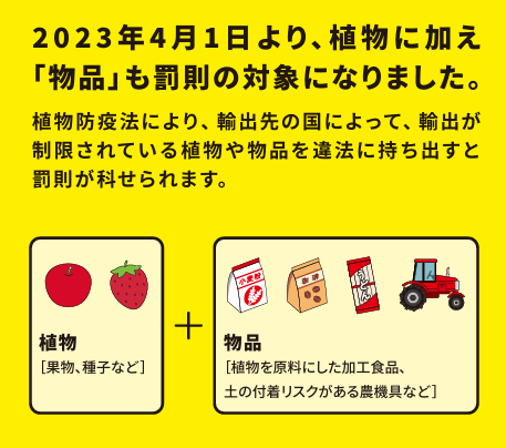 2023年4月1日からは、植物に加えて「物品」も罰則対象となった。これにはコーヒー豆や小麦粉など植物を原料とする加工食品も含まれている。違反者に科される罰則は、個人であれば3年以下の懲役または300万円以下の罰金、法人の場合は500万円以下の罰金とそれぞれ規定されている。(編集:耕雲)