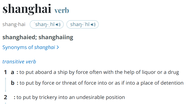 実は、具体的な都市名が名詞以外の品詞の意味を持つことがある。オックスフォードやウェブスターなどのオンライン辞書で「Shanghai」と検索してみると、「船員をだまして強制的に船に乗せる」という意味が含まれていることが分かる。
