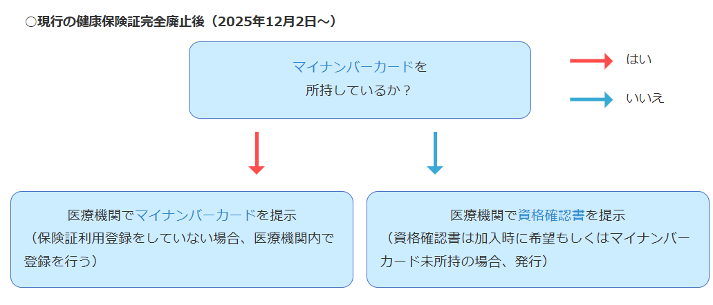 現行の健康保険証は来年2025年12月1日まで使用が可能だが、それ以降に保険診療を受ける場合は、経過期間にマイナ保険証か「資格確認書」のいずれかの取得が必要になる。