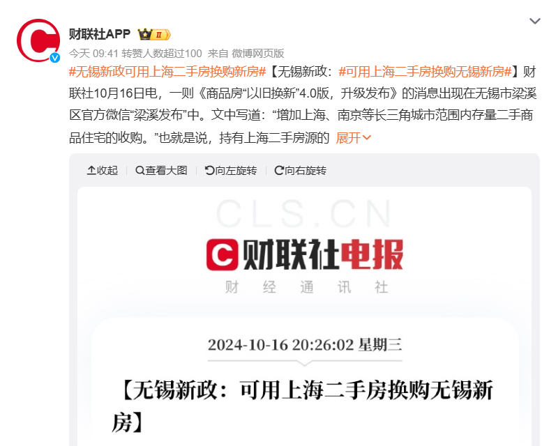 こうした中、無錫市梁渓区が16日に打ち出した「中古物件買い替えバージョン4.0」と呼ばれる政策にも注目が集まっている。上海で中古住宅を所有する住民が同市区の定める主体にその中古住宅を売却すると、同区内で指定されている新築住宅を購入できるというものだ。