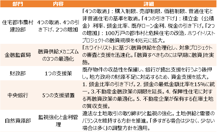 不動産市場の安定化を目指す中国政府が17日、大規模な融資支援策を発表した。年末までに「ホワイトリスト」に基づく融資規模を4兆元に拡大し、資金不足で工事が滞っているプロジェクト等を支援していく。なお、江蘇省無錫市では、上海や南京の中古住宅と新築住宅の交換を促進する政策が打ち出され注目を浴びている。