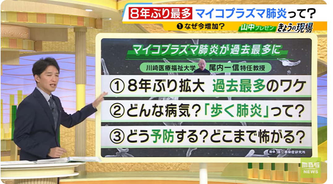「歩く肺炎」(walking pneumonia)とも呼ばれ、発熱や頑固な乾いた咳を特徴とするマイコプラズマ肺炎(中国語:支原体肺炎)の感染が日本で拡大している。NHKなど主要メディアは、全国の患者数が3週連続で過去最多を記録しており、1医療機関あたりの平均患者数が1.95人にのぼると報じた。