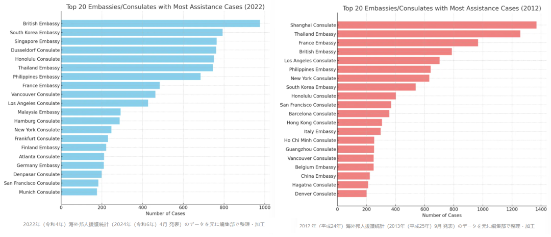 『援護件数統計』によれば、2022年の「交通機関事故(交通事故、船舶・航空・列車事故含む)」による援護件数は全世界で27件となっており、2013年の143件、2015年の116件と比較して減少している。日本人による道路交通法違反の件数も、2013年の46件、2015年の38件から、2022年には4件と大幅に減少した。むしろ、昨今では日本国内で訪日外国人によるレンタカー事故が増加していることが問題視されている。