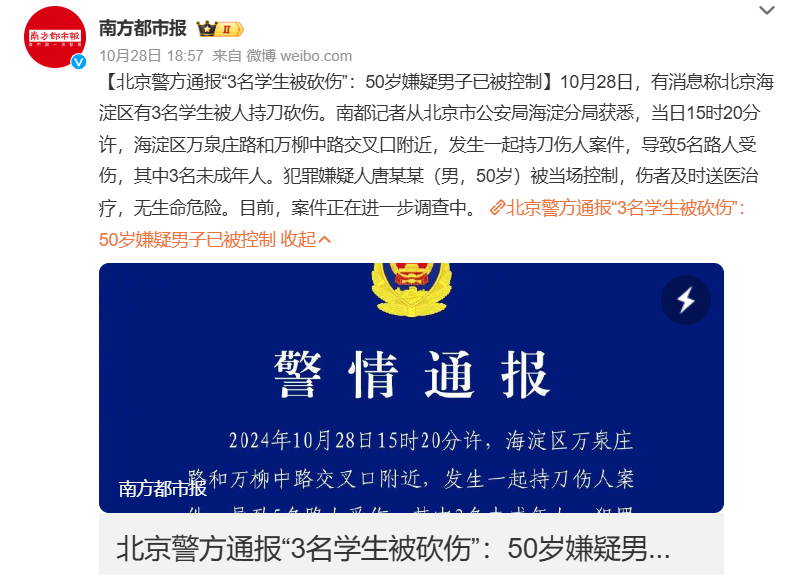10月28日午後、北京市海淀区の小学校付近で刃物を持った男が通行人を襲撃し、5人が負傷したが、日本人の被害は確認されていない。容疑者は既に拘束され、詳細は捜査中である。現場の海淀区は教育機関やハイテク企業が集まる治安の良好な地域とされ、今回の事件は地域住民にも衝撃を与えた。