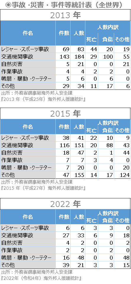 道路交通のみならず鉄道、海上、航空交通でも邦人が犠牲となった事例は少なくない。2013年のエジプト・ルクソール熱気球墜落事故(19名の死者のうち4名が日本人観光客)や、2002年の中国北方航空放火墜落事件(日本人3名が犠牲)、さらには1988年の上海列車事故(修学旅行の高校生29名が死亡)などは代表的なものだ。
