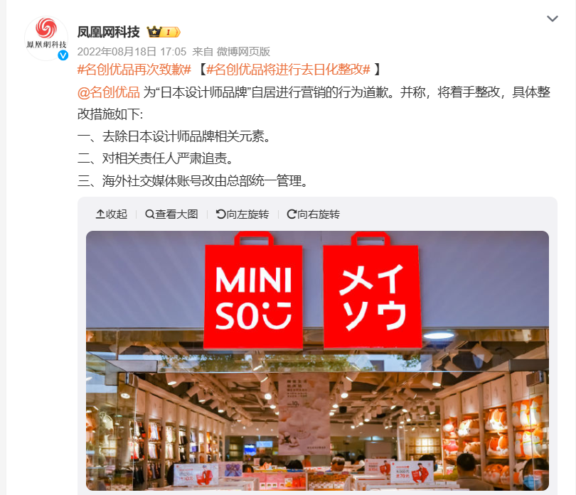 発展初期に「日本人デザイナーブランド」として展開していた事実を名創優品は認めている。その後は日本イメージの払拭と中国風のトレンドを重視する方針を示し、ロゴもカタカナの「メイソウ」の表記を廃して、中国語表記に変更した。(編集:耕雲)