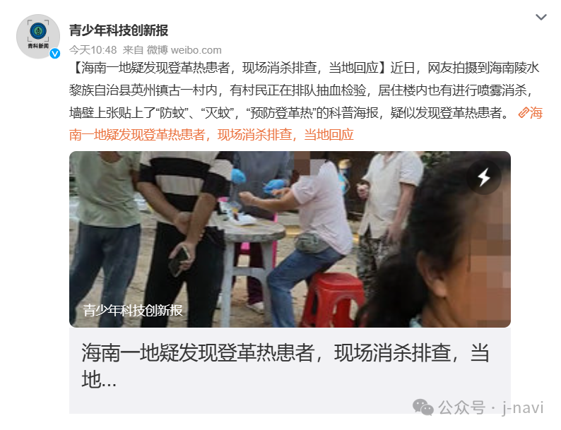 一方、海南省陵水黎族自治県の英州鎮古一村で一週間前にデング熱の患者が発生し、村民が血液検査のために列をつくる様子や、建物内で蚊の駆除作業が行われる様子がSNSで拡散し、話題になった。建造物には「蚊の防除」「蚊の駆除」「デング熱予防」といった標語を掲げたポスターが張られている。