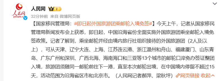 人民網など中国メディアが伝えたところによると、中国国家移民管理局は5月15日午前に記者会見を開き、クルーズ船で旅行する外国人団体観光客向けにビザ免除政策を同日から実施すると発表した。同一の船舶で次の港まで移動する限り、15日間以内の中国滞在が可能になる。