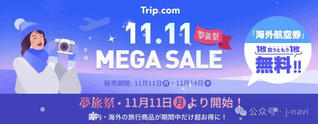「飛猪網」のライバルである「Trip.com」は「夢旅祭 11.11 MEGA SALE」を11月11日から4日間開催。ホテルや航空券が最大50%割引だ。ウェブサイトではフラッシュセールやクーポン配布の情報もアナウンスされているので注目したい。