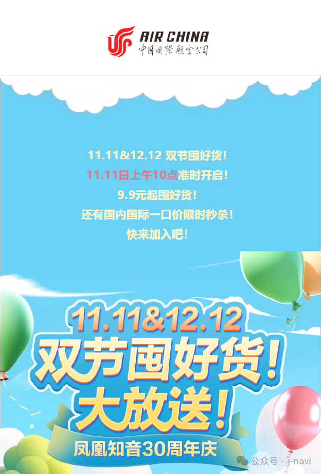 ダブルイレブンを逃しても次は12月12日の「ダブル12」がある。規模は小さめだが、オフラインの店舗割引が充実している。中国国際航空はダブル12にもセールを実施予定。先手を打ち、情報収集にアンテナを張っておくことが特価チケットを獲得する鍵となるだろう。(編集:耕雲)