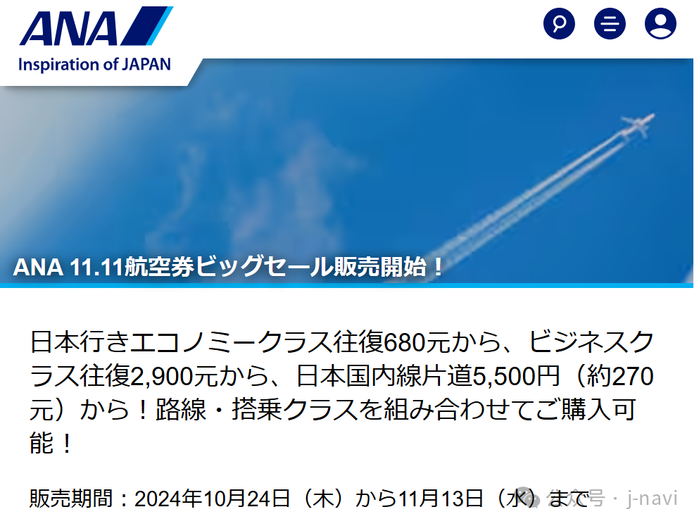 日中路線を運航する航空会社が続々と「ダブルイレブン」セールを打ち出している。全日空(ANA)は北京・上海・広州・深圳・大連・青島・杭州発日本行き直行便を680元(約13,500円)から、ビジネスクラスは2,900元(約58,000円)から販売。セールは11月13日まで。