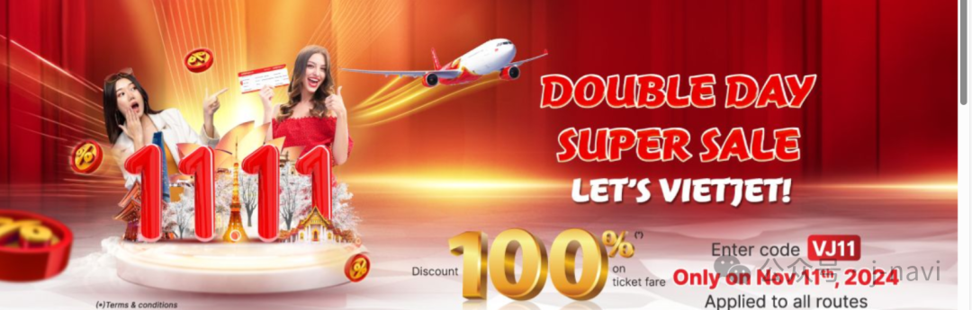 ダブルイレブンはいまや国境を越え、中国本土以外でも熱狂を巻き起こしている感がある。ベトナムのLCC「ベトジェットエア」はなんと最大100%割引(税・手数料別)で航空券を提供する。