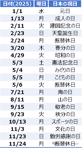 2025年の祝日日程が発表