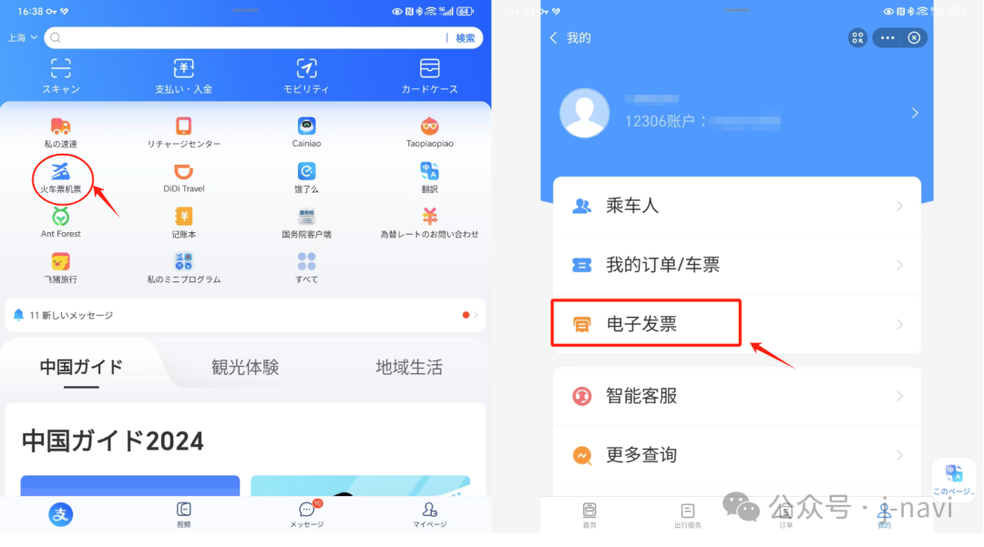 鉄道の「電子発票」はアリペイの「火车票机票」をタップし「我的(私の/マイ)>电子发票」に進んでも申請可能だ