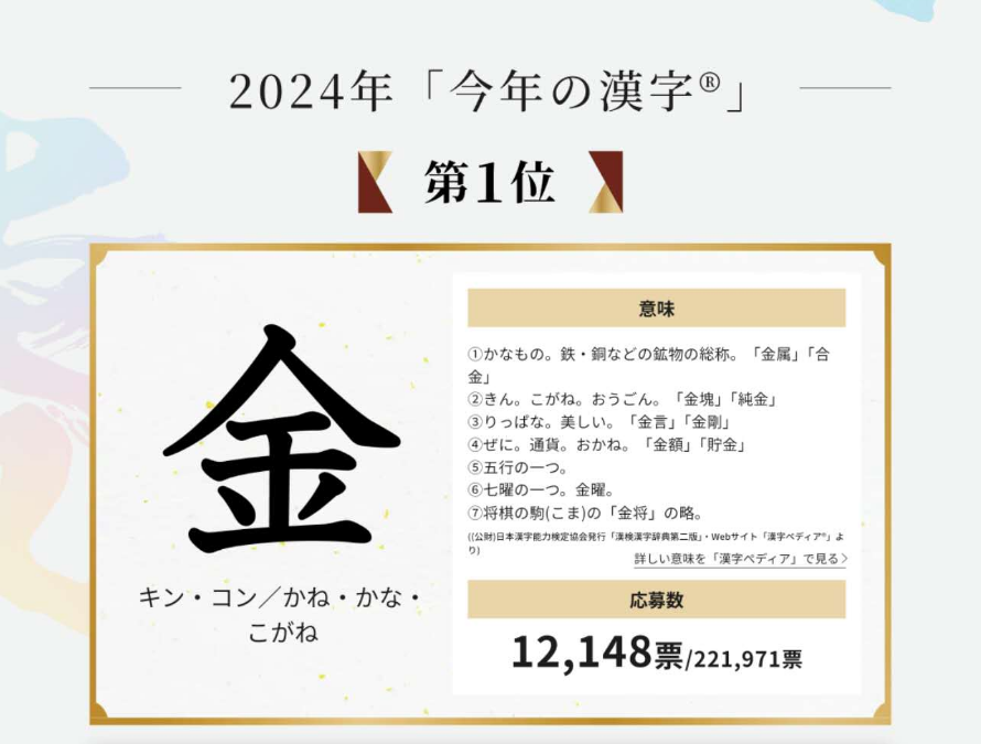 毎年恒例となった年末の風物詩、「今年の漢字」が発表された。2024年の世相を代表する漢字に選ばれたのは「金」で、希望の“光”とともに“影”の側面も映し出している。同イベントは1995年に始まり、今年で30周年を迎えた。