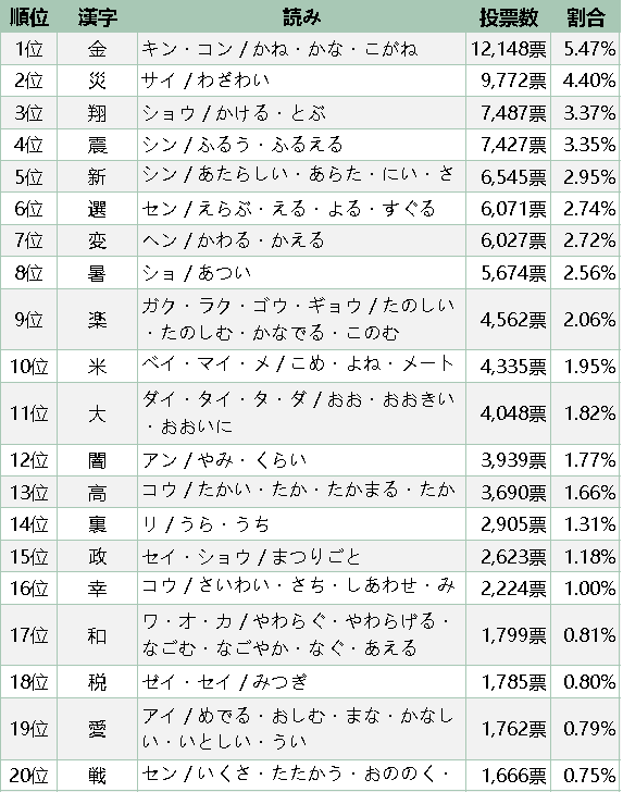 年初の能登半島地震や航空機事故を受けて得票数が「金」の次に多かった「災」は2004年(平成16年)と2018年(平成30年)に「今年の漢字」に選出されている。また、「税」は2023年(令和5年)以前にも、2014年(平成26年)に選出された経緯がある。(編集:耕雲)