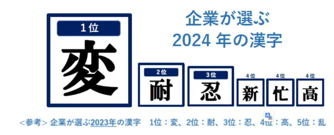 「今年の漢字®」|公益財団法人 日本漢字能力検定協会 2024年の漢字、2年続けて「変」がトップ “変化”し続ける事業環境を前向きに捉え、“新”たな挑戦で自らも“変化” | 株式会社帝国データバンクのプレスリリース (プレスリリース)【MERY Z世代研究所調査】Z世代が選んだ「今年の漢字」&「2025年やりたいこと」ランキングを公開!|ニフティニュース