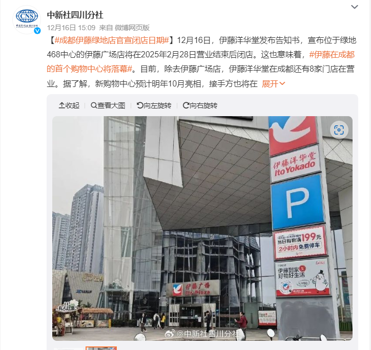 消費トレンドの変化が激化する中、2024年は日系小売企業における閉店、撤退が相次いだ。上海の梅龍鎮伊勢丹百貨店は27年間の歴史に幕を閉じ、ダイソーは上海で2店舗を閉店した。さらに、四川省成都市にあるイトーヨーカドーの「伊藤広場店」も閉鎖が決定している。