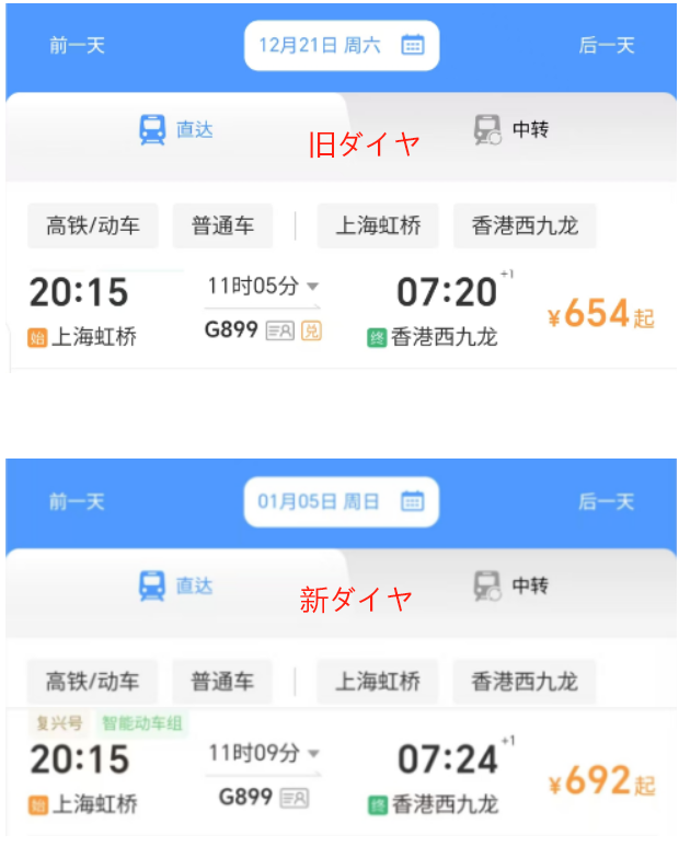 北京と香港を結ぶ高速鉄道の所要時間が短縮された点も目を引く。新ダイヤでは、北京西駅発G897列車の香港西九龍到着時刻が7時45分から7時12分に変更しており、33分の短縮が実現した。対照的に、上海虹橋と香港西九龍を結ぶG99列車では、発車時刻が従来の14時09分から13時53分となっており、所要時間が16分増加している。