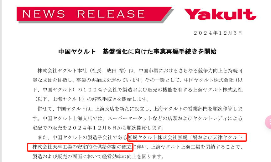 ヤクルトは2024年12月6日に上海工場(上海益力多)の解散手続きを進めると発表した。この決定は、生産拠点を天津と無錫に集約し、効率的な運営と事業拡大を目指す戦略の一環とされている。2025年1月現在、上海のスーパー等の売り場からはすでに上海工場で生産された製品は消え、近隣の無錫工場で生産された「養楽多」シリーズに置き換わっている。