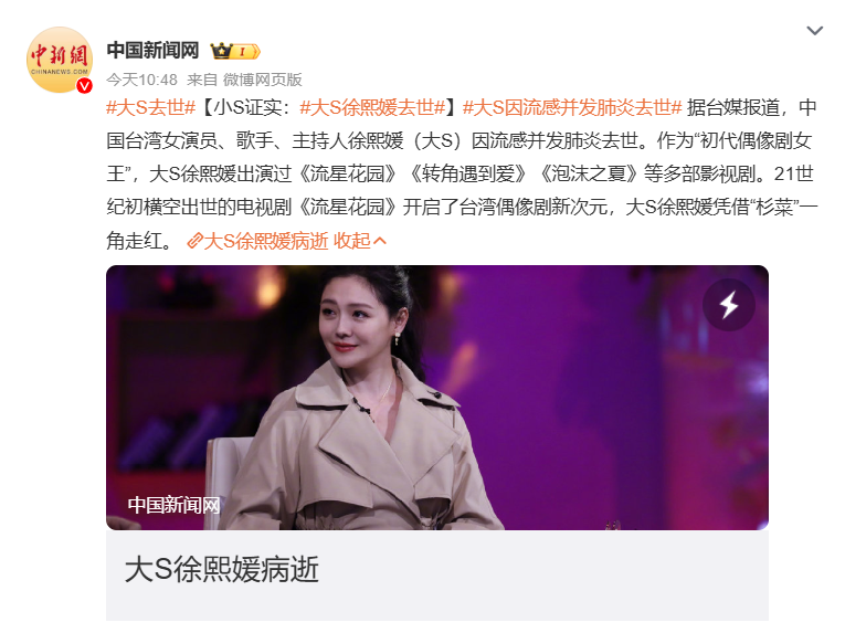 台湾の女優、歌手、テレビ司会者として広く知られるバービィ・スー(徐熙媛、大S)が2月2日に48歳で亡くなった。彼女の死因については、インフルエンザと肺炎の併発が報じられており、家族と共に日本旅行中に発症したものとされている。