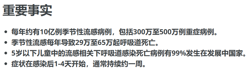 WHO(世界保健機関)は、季節性インフルエンザの感染例が毎年世界で10億例に及び、そのうち300万〜500万が重症化している実態や、29万〜65万人が呼吸器疾患関連で命を落としていることをホームページで言及している。罹患を予防する対策としては、手洗いや消毒、マスクの着用、十分な休養と栄養補給を心がけるとともに、毎年のワクチン接種が推奨され、特に高リスク群への接種が重要だとする啓蒙が行われている。(編集:耕雲)