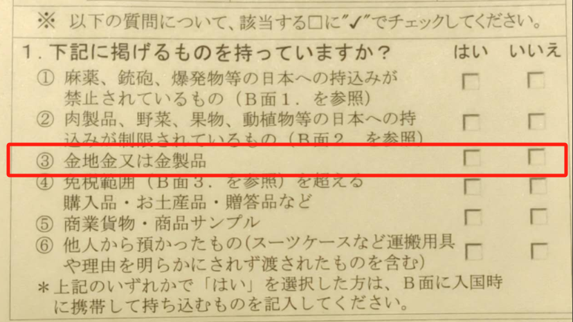 日本に入国する際、VJW(Visit Japan Web)での操作、または「携帯品・分離輸送手荷物申告書」の提出による税関申告が義務付けられており、ネックレスやブレスレット、指輪などの金製品も申告対象となる。免税範囲は20万円までで、1キロを超える場合は消費税の課税対象となり、適切な申告が求められている。近年、違反事例が増加しており、在日本中国大使館も訪日中国人に対して注意喚起を行っている。