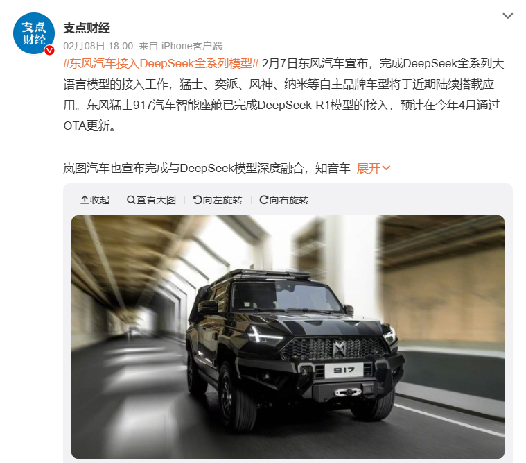 東風集団も自社ブランドのスマートコックピットシステムにディープシークのAIを組み込み、音声アシスタントの精度向上に役立てたという。ディープシークは低コストで高性能なオープンソースとして提供されており、今後も車載システムでの利用が進むことが予想される。