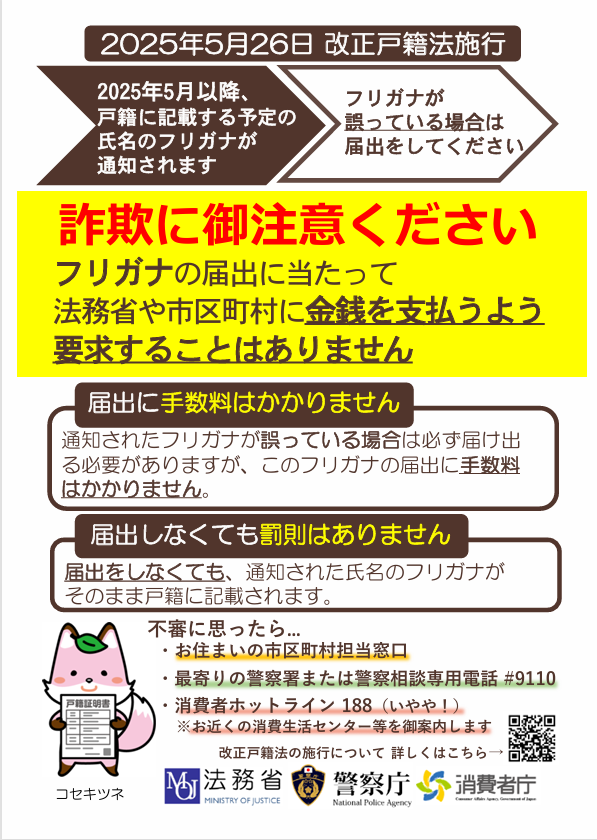 戸籍にフリガナが記載されます|法務省 戸籍の振り仮名の届出に関連する詐欺にご注意ください | 消費者庁 戸籍の振り仮名制度を悪用した詐欺に注意!| 注意喚起・お知らせ | SOS47の活動 | 警察庁・SOS47特殊詐欺対策ページ