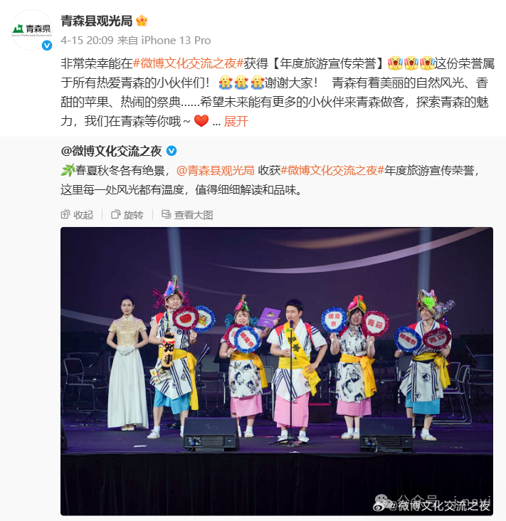 青森県は4月15日に開催された「2025微博(Weibo)文化交流ナイト」で観光振興賞を受賞した。同県の公式 Weibo アカウントでは、弘前の桜、ねぶた祭、冬の八甲田など四季折々の魅力を中国語で発信し続けており、2025年4月現在のフォロワー数は130万人を突破。大阪観光局の約16万人を大きく上回っている。