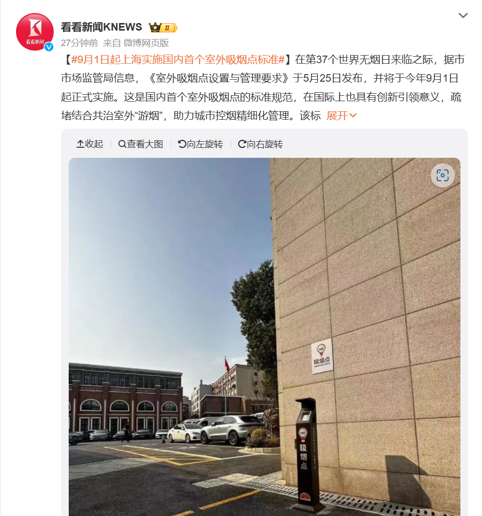 第37回世界禁煙デーを目前に、上海市は5月25日、「屋外喫煙所の設置と管理に関する要求事項」を発表し、9月1日から正式に実施する方針を明らかにした。背景には、公共の場での受動喫煙による健康被害を減少させるという目的がある。現在、屋外喫煙所に関する国家基準が存在しないため、他市に先駆けた同市の取り組みに注目が集まっている。