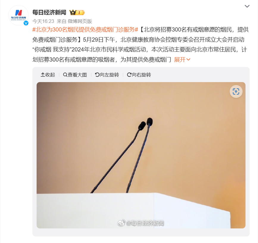一方、北京市では「北京喫煙規制条例」の施行10周年を機に、本日29日、北京健康教育協会禁煙専委会が「2024年北京市民科学禁煙活動」をスタートさせた。同市に常住する住民を対象に、禁煙の意思があるヘビースモーカー300名を募り、無料の禁煙外来サービスを提供するというユニークなものだ。