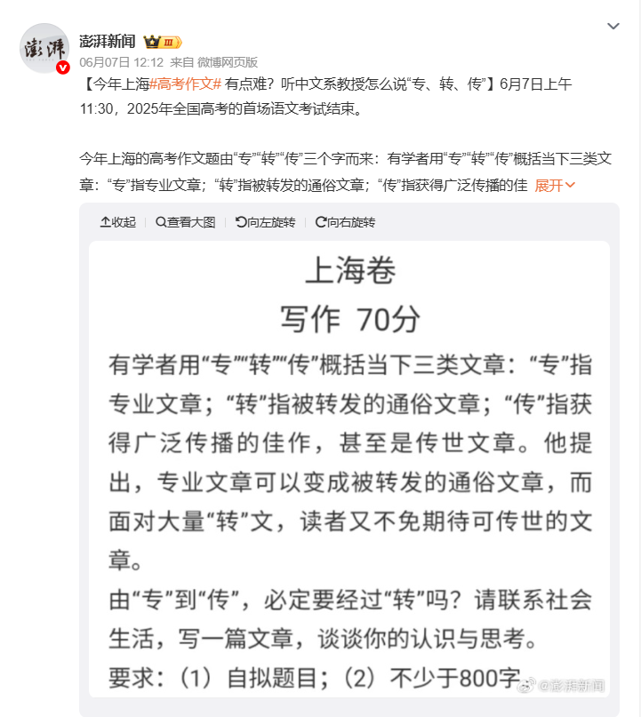出題者である華東師範大学の終身教授・胡暁明氏(上海写作学会会長)は、専門的な「専」、それを大衆化する「転」、さらに時代を超えて読み継がれる「伝」という三段階の発展モデルとして提示し、受験生に対して“伝”に至るには“転”が必須かを問う構成となっている。