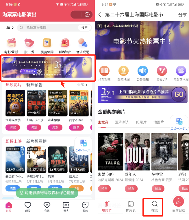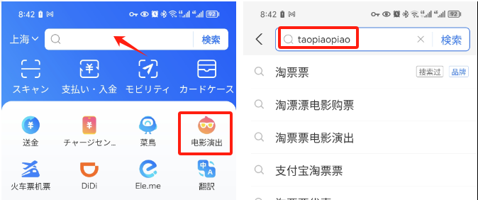 上映チケットの購入予約はアリババグループのオンライン映画チケット購入プラットフォームである「淘票票(TaoPiaoPiao)」(アプリおよびミニプログラム)で行う。