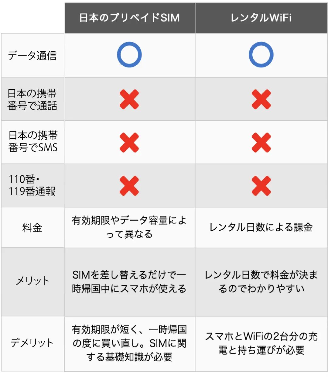 プリペイドSIMやWiFiとの比較