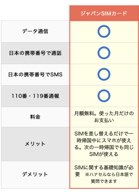 これらのサービスと、一時帰国専用SIM「ジャパンSIMカード」の違いを以下に紹介します。