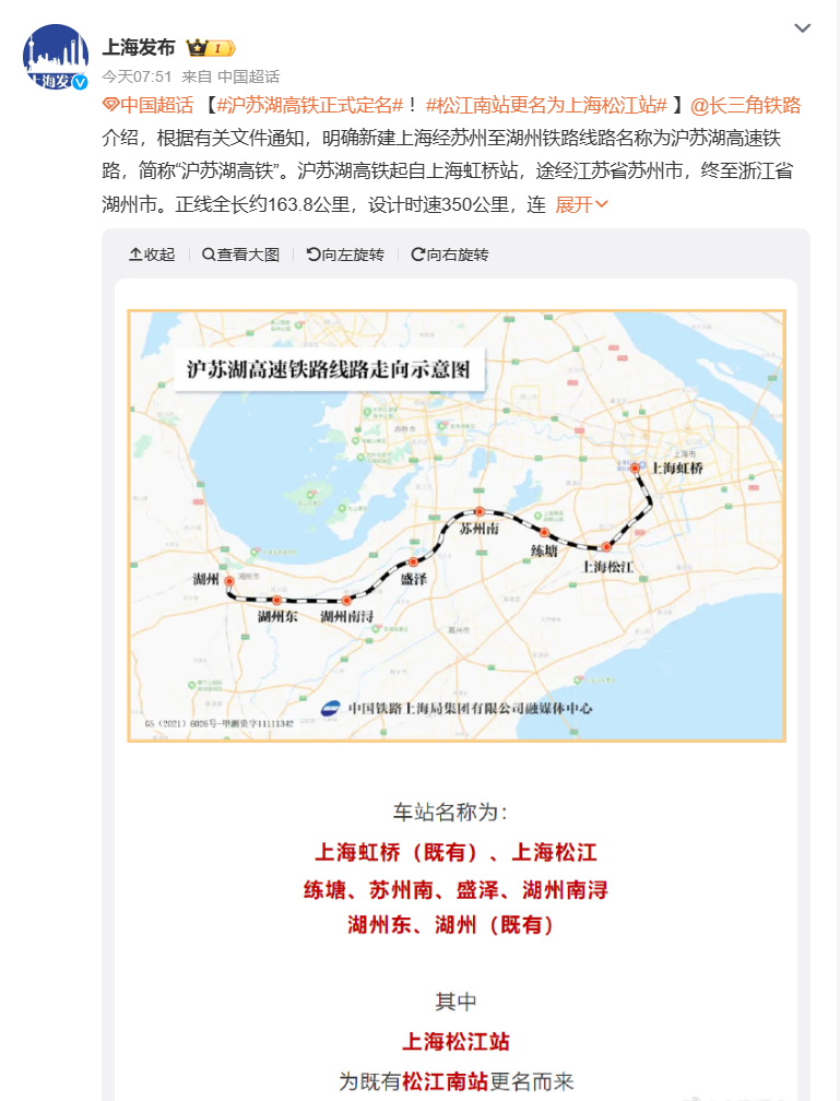 松江南駅が上海松江駅へ改称される。名称変更は、単なる名称変更以上の意味を持つ。滬蘇湖高速鉄道と連携して長江デルタにおける新たな発展の核となる可能性を秘めている。