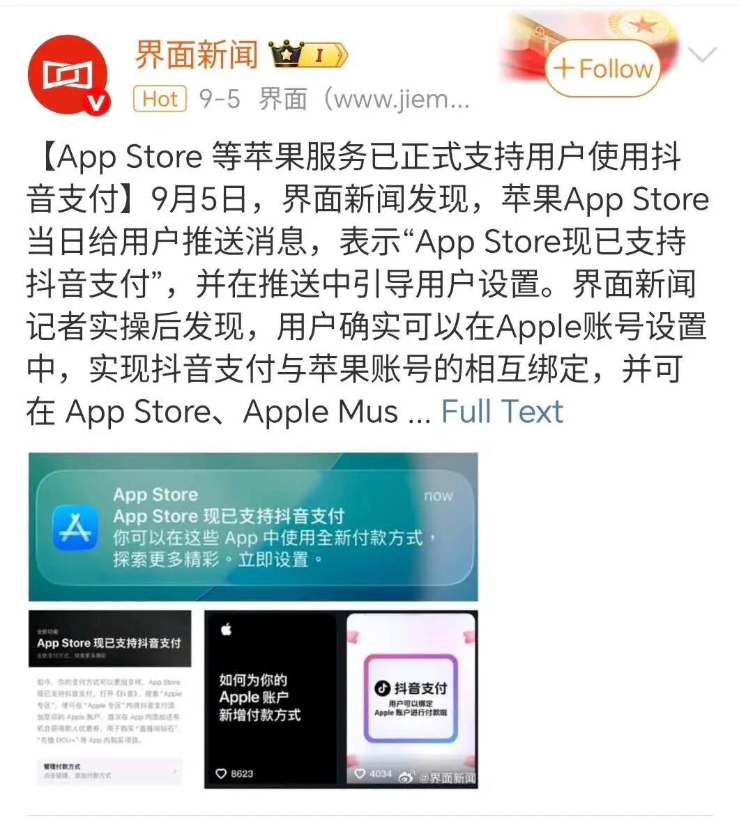 2025年9月初旬の報道によれば、抖音支付はすでに生鮮配送アプリ「朴朴超市」やApple App Storeと接続。さらに一部の店舗では、スマート端末にかざすだけの「碰一下(タッチ決済)」を試験導入している。