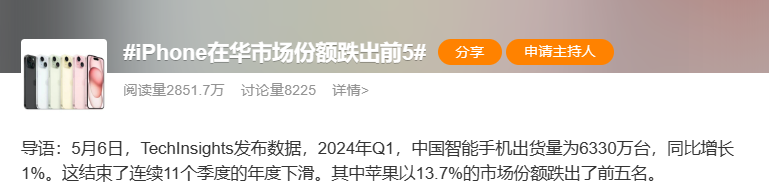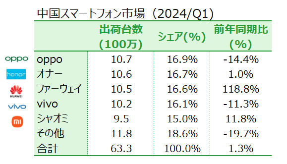 知財、技術投資等のコンサルティングを事業とするテックインサイツ(TechInsights、本社カナダ)が5月6日に発表した中国のスマートフォン市場に関するレポートによると、中国本土のスマートフォン出荷台数は第1四半期(2024年1~3月)、前年同期比1.0%增の 6.330万台を記録した。過去11四半期にわたる減少に歯止めがかかったかたちだ。