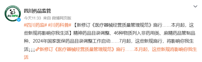 7月1日から、咳止め薬のデキストロメトルファン(メジコンⓇ、中国語名:右美沙芬)をはじめ、ナフラフィン、ロルカセリン、ジフェノキシレートといった複方製剤、ミダゾラム原料および注射剤の管理が強化された。これらの薬品は新たに第二類または第一類の向精神薬に分類され、製造企業は定点生産資格および生産計画を申請しなければならない。