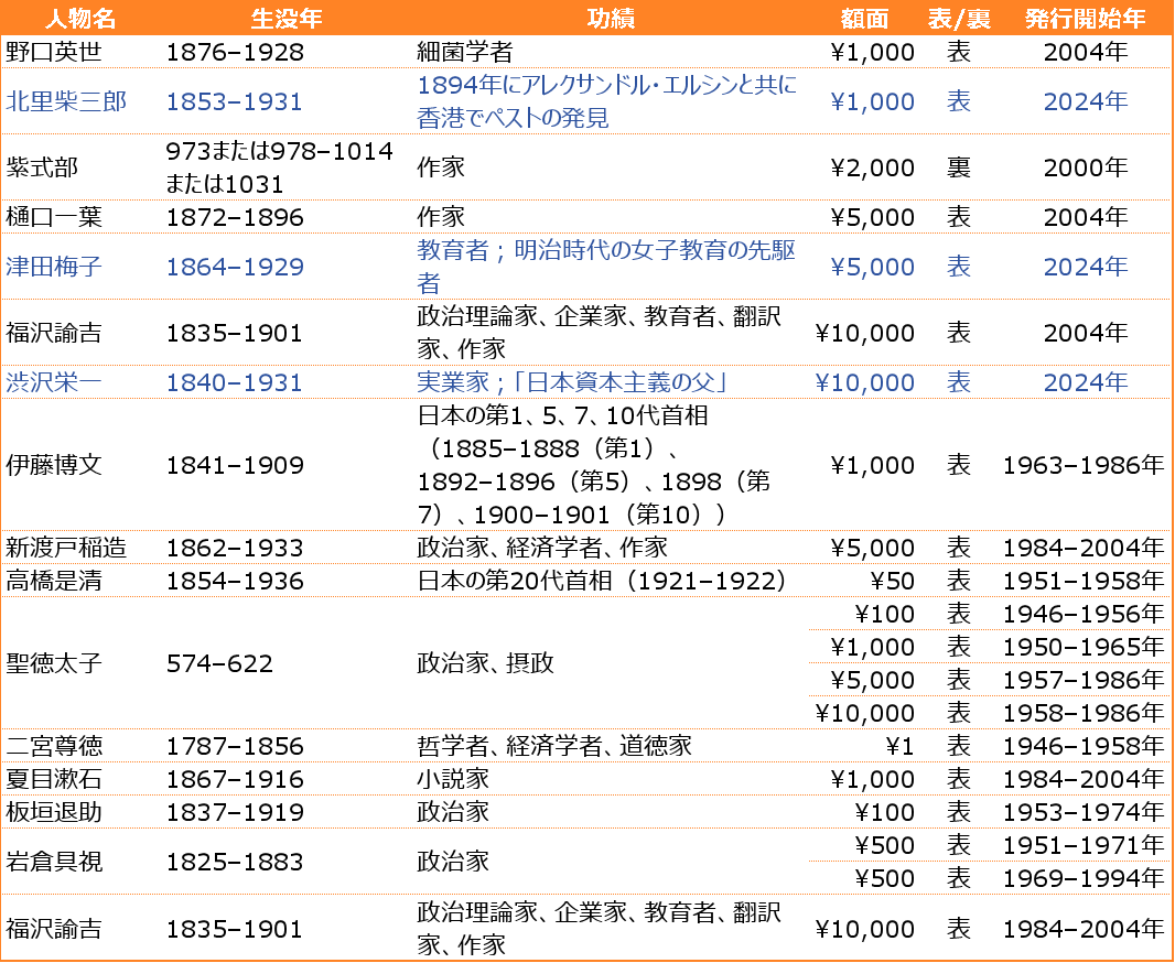 日本の紙幣に描かれている肖像画人物のリスト:Wikipedia(英)の情報を元に編集部で翻訳・加工