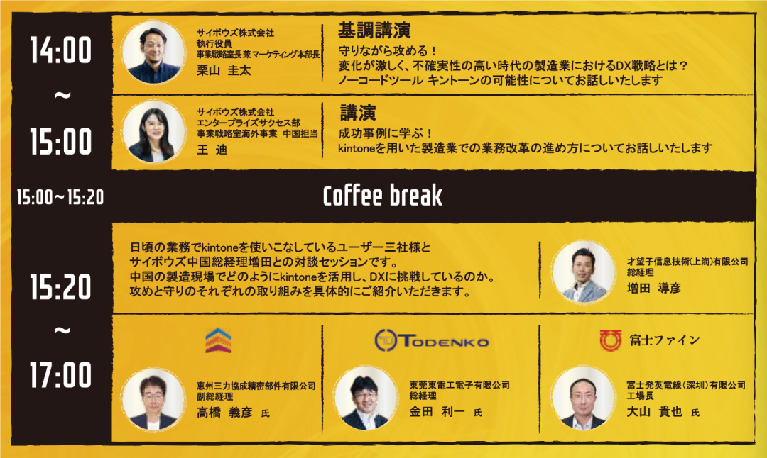在華南製造業の日系企業3社が登壇し、製造現場でのキントーン活用事例を交えながら「攻めと守りのDXへの挑戦」について赤裸々に語ります!